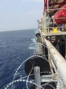 Maritime Security Alliance has invented a different type of razor wire system based on an already existing crowd control system. This new Quick Removable Razor Wire system was successfully tested by a Dutch heavy lift vessel while sailing through a high risk area in West-Africa, earlier this year. This innovative razor wire is unlike normal razor wire installed on simple brackets and is designed to have a thick steel wire through the core of the razor wire coil. The steel wire keeps the coil in its place during a razor wire sabotage attempt during a hijacking attempt.